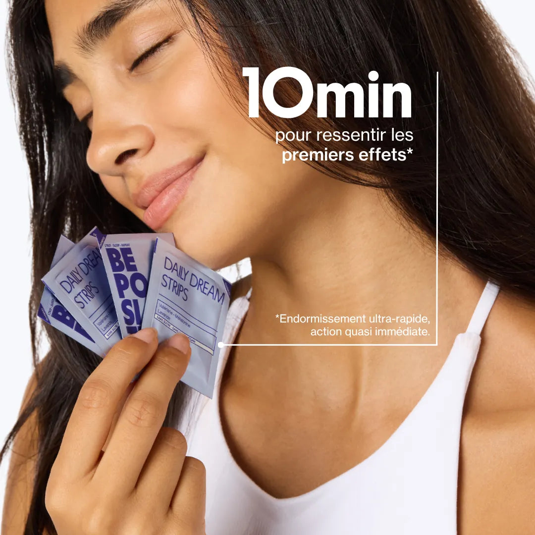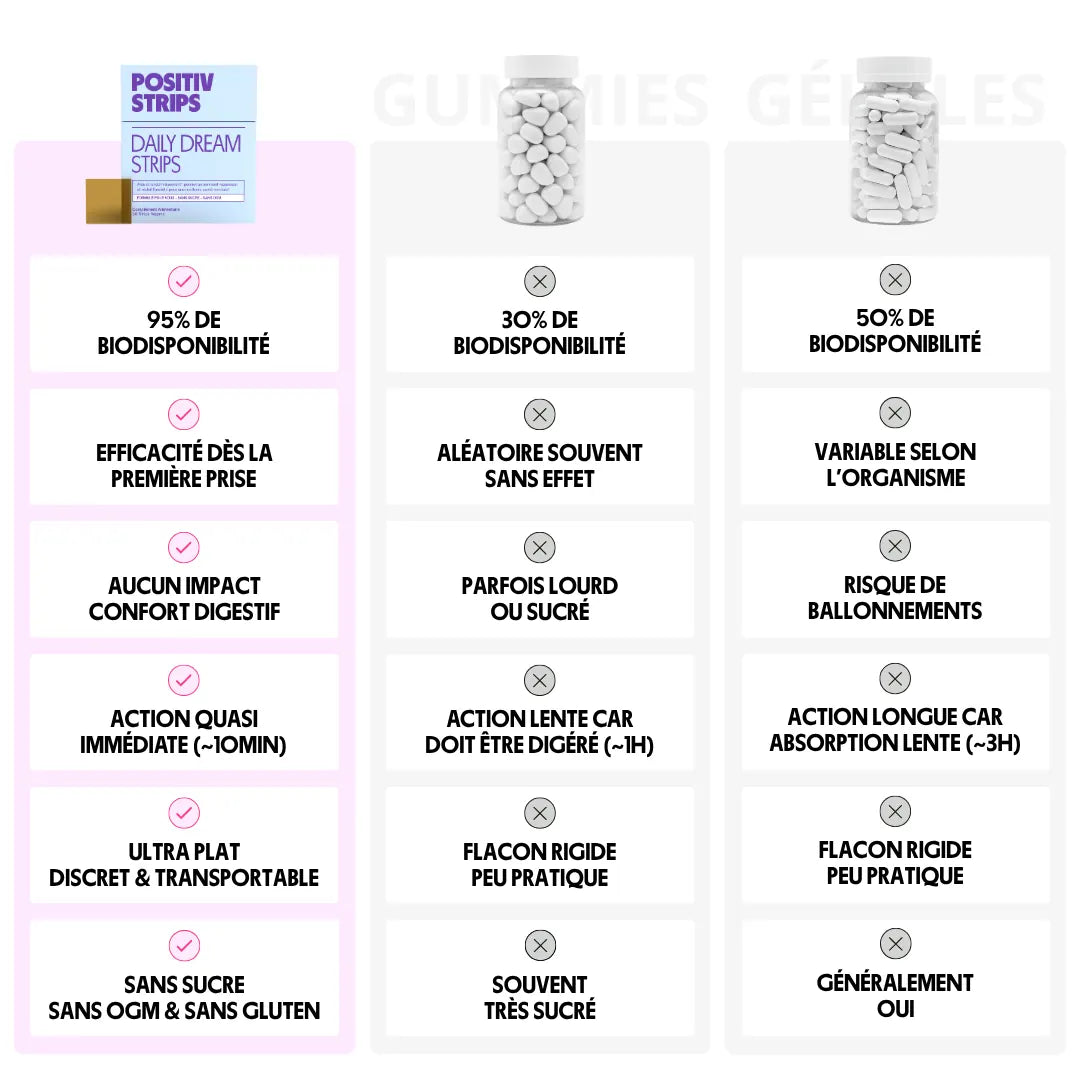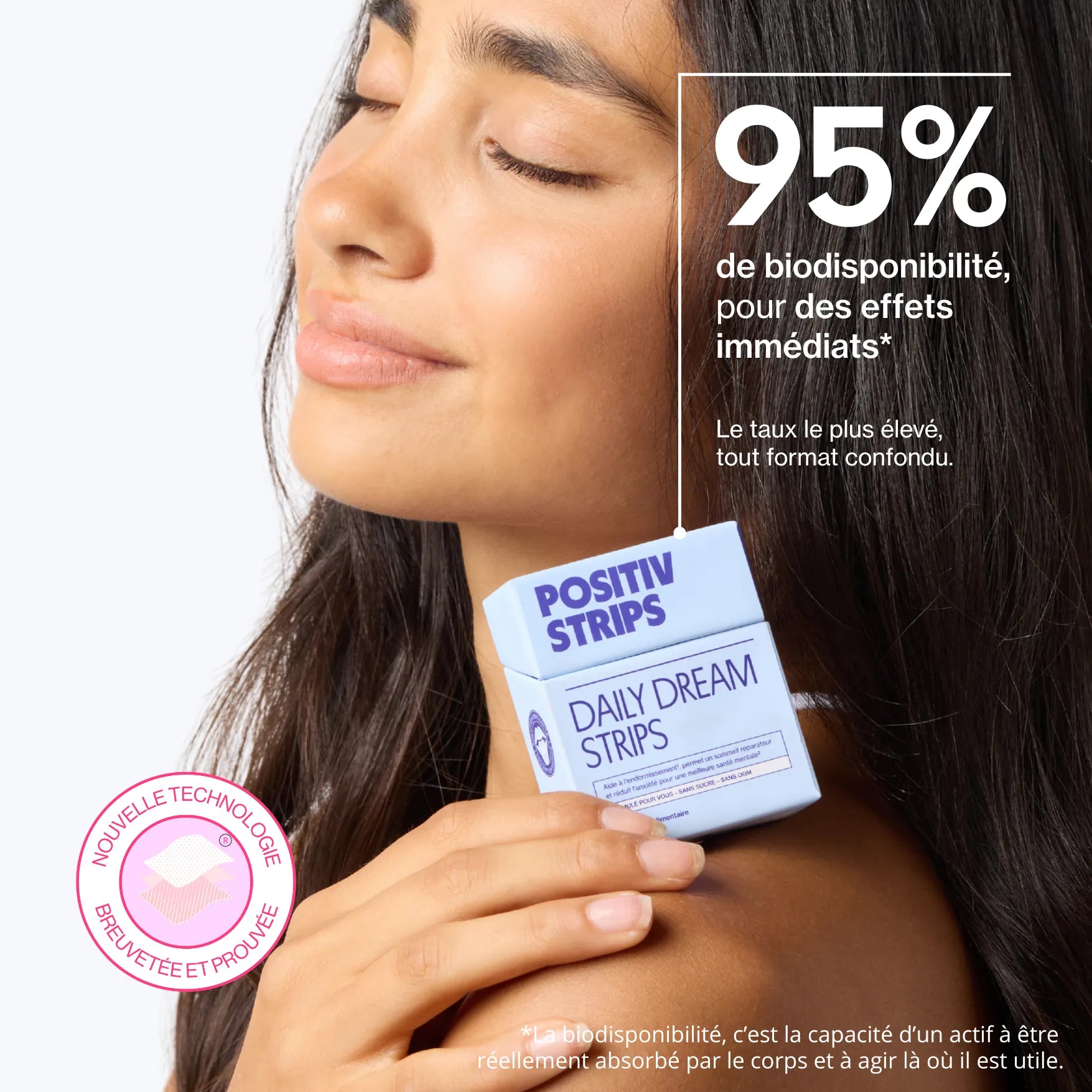 Les actifs Daily Dream sont absorbés par les muqueuses buccales, ce qui permet d’atteindre jusqu’à 95% de biodisponibilité. La biodisponibilité, c’est la part d’un actif qui atteint réellement la circulation sanguine pour produire son effet. Là où les gélules ou gummies perdent jusqu’à 70% de leurs effets, Daily Dream maximise chaque dose avec moins de perte pour plus d'efficacité et de résultats.